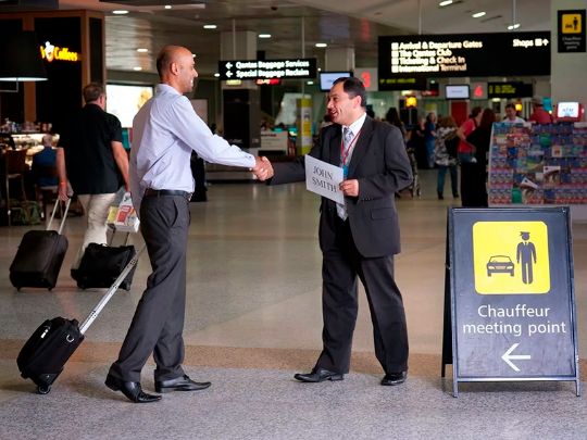 Водитель приветствует своего пассажира, берет его багаж и ведет к машине.